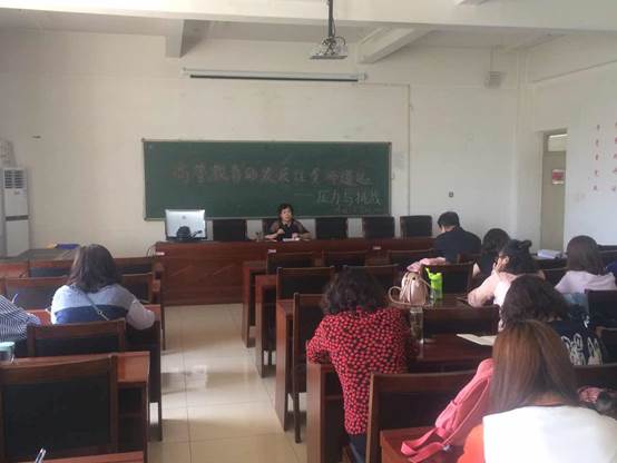 2018年4月27日下午,外国语公司党总支书记李薇教授为全体教职工党员讲党课,主题为:高等教育发展任重而道远----压力与挑战。