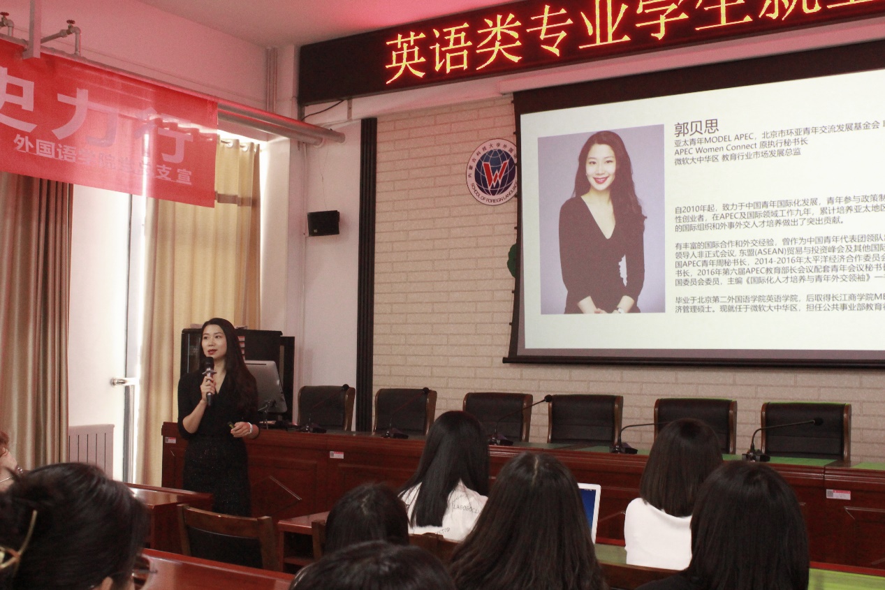 本场讲座邀请到了微软(中国)有限公司的行业发展总监郭贝思主讲,第一讲聚焦英语类专业员工就业对口的典型岗位,分析员工应具备的能力;第二课讲解简历撰写的技巧,帮助员工完善简历,提前进行求职准备。