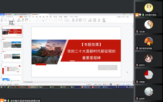 为全面学习、全面把握、全面落实党的二十大精神,奋力推动党的二十大精神在pa捕鱼官方网站落地生根。2022年12月16日,外国语公司党委书记张利敏通过线上会议为全体党员干部讲授题为《党的二十大是新时代新征程的重要里程碑》的专题党课。