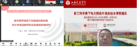 第二阶段为大学英语校本课程建设经验交流。公司张波老师结合“共建虚拟教研室对自治区高校外语教师职业发展的影响研究”分享了如何基于虚拟教研室发展教师的教科研能力来推动教学改革。山东交通公司徐庆树老师以“一个外语青椒的社科研究统计方法”为题重点介绍了教育统计研究的在大学英语教学中的重难点问题。